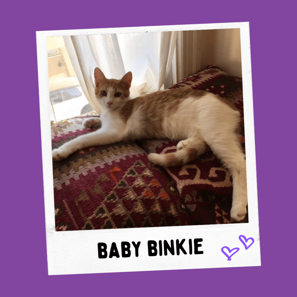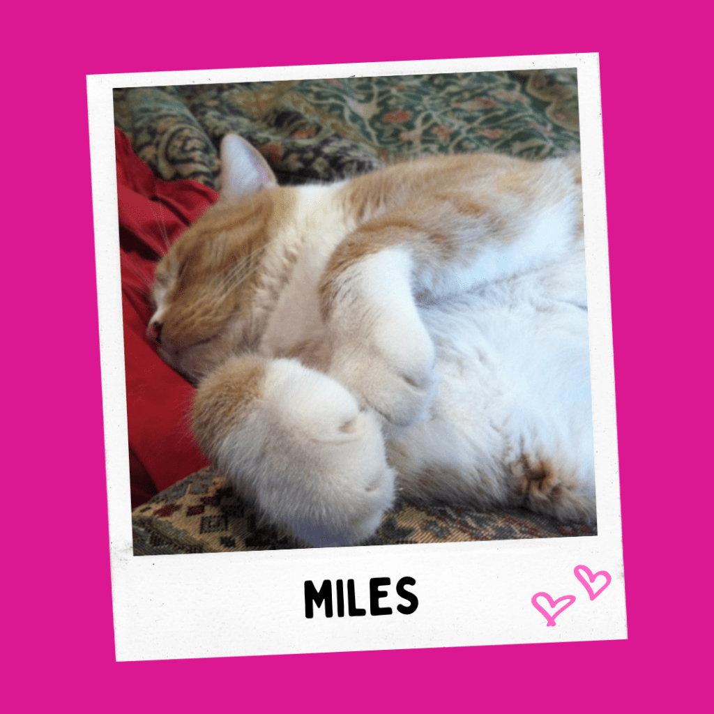 Willyrubin was from the alley behind Bootleg Theatre. Miles was put in my hand by a woman who said she was going to the bathroom at the vet’s as I bought cat food, but she never came back for the guy the size of a cotton ball, so I took him home where Miles grew to be 30 lbs and got offers from the NFL. Binkie came from a rescue foster home; Sante D’or, or Sal Parmesan, from a shelter.